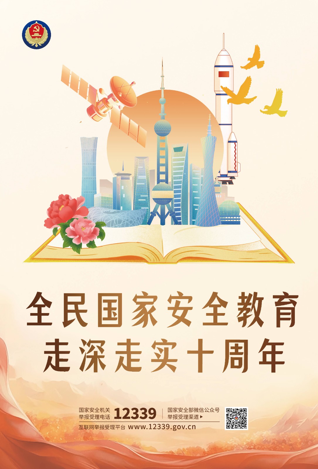 2025年4月15日是第十個(gè)全民國(guó)家安全教育日,今年的主題是:全民國(guó)家安全教育,走深走實(shí)十周年。國(guó)安宣工作室發(fā)布系列海報(bào),強(qiáng)調(diào)要堅(jiān)定不移貫徹總體國(guó)家安全觀,推進(jìn)國(guó)家安全體系和能力現(xiàn)代化,完善國(guó)家安全法治體系,提升國(guó)家安全工作法治化水平。